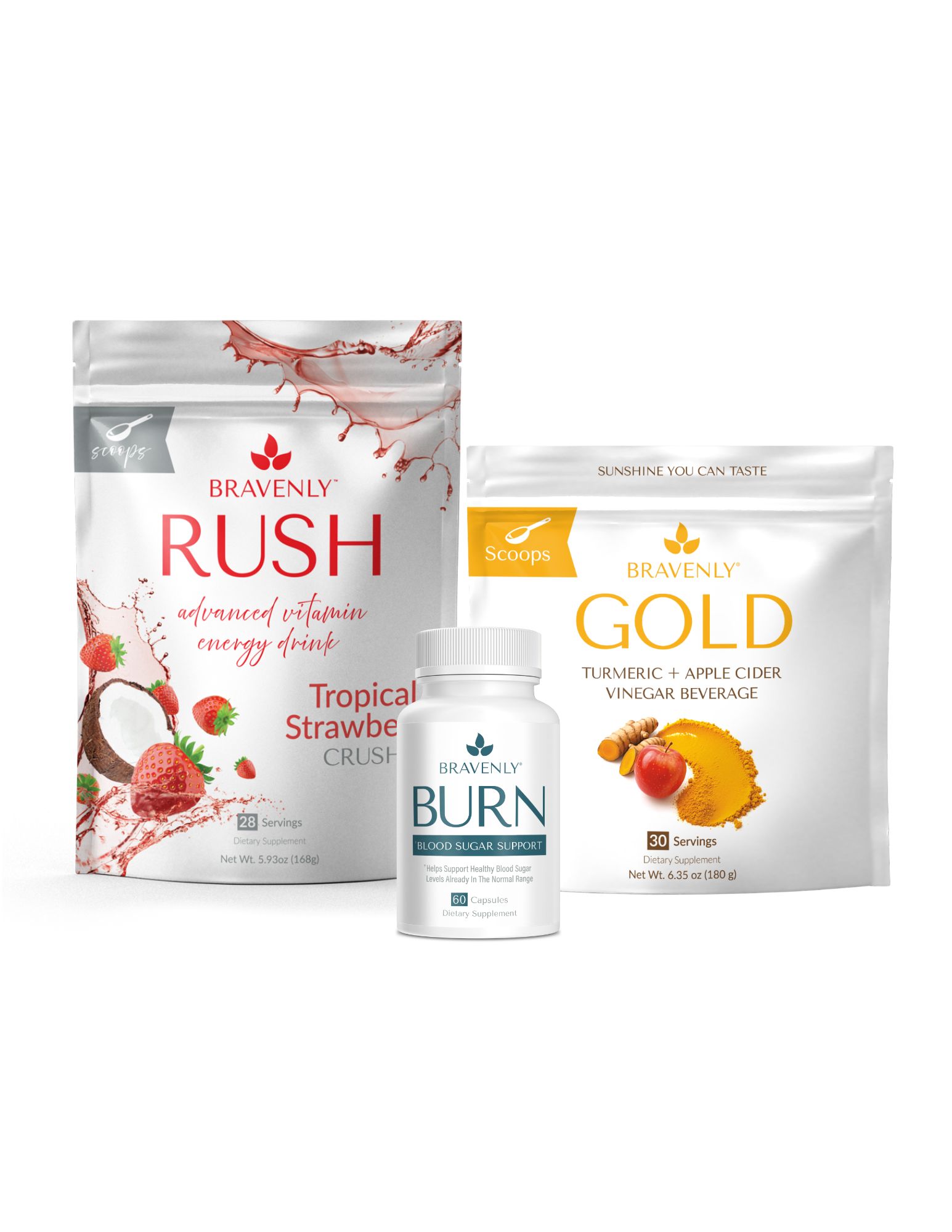 Included: Burn, Gold (scoops or capsules), and your choice of Rush (scoops)